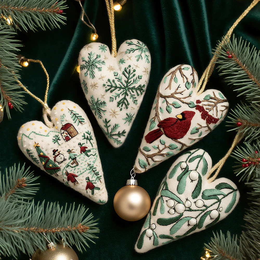 1*Heart Shaped Hand Embroidered Christmas Ornament/Ornament Kit