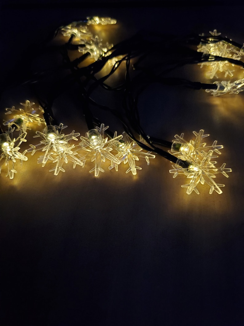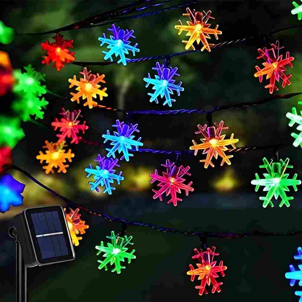 ✨Each strand features 20 snowflake-shaped LED lights on a 9-foot black wire and runs completely on solar power — no outlets needed. The built-in solar panel charges by day and lights automatically at dusk.✨