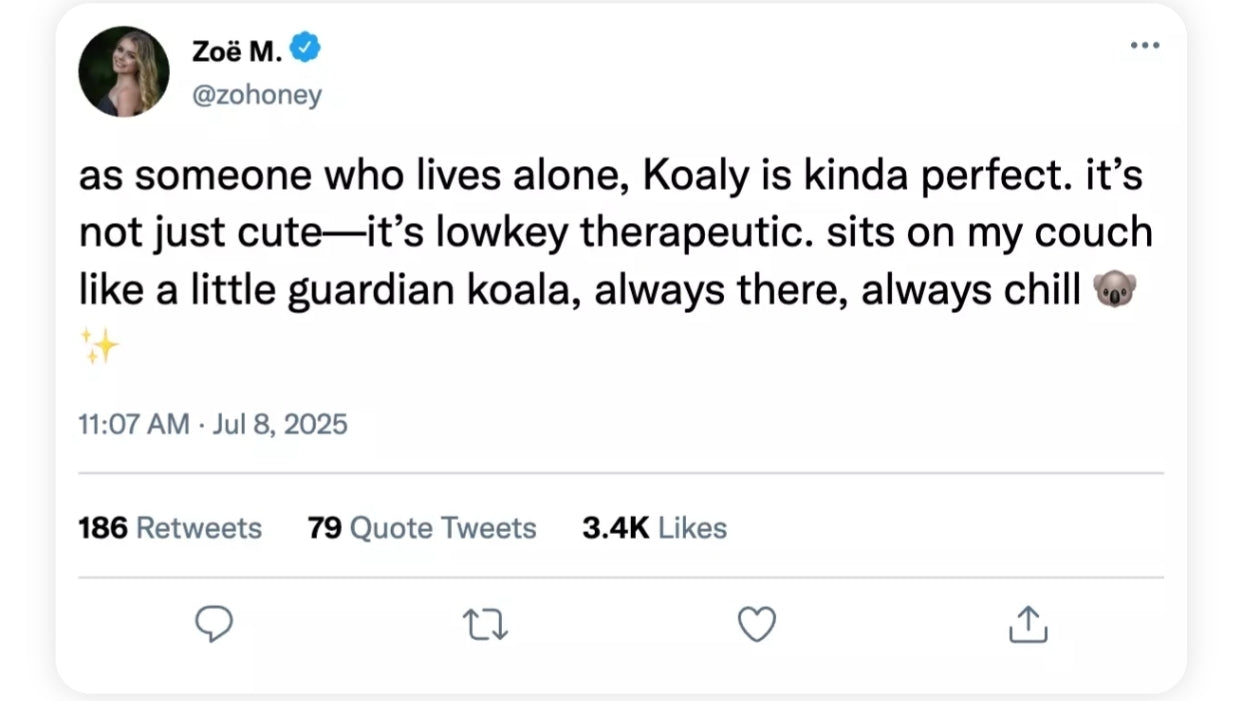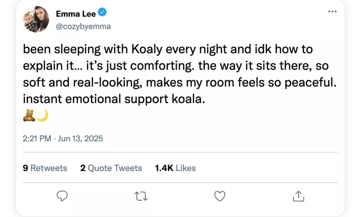 'As someone who loves comfort, Koaly is the perfect companion. It’s soft, soothing, and makes every moment feel a little more peaceful — like an instant hug when you need it most.'